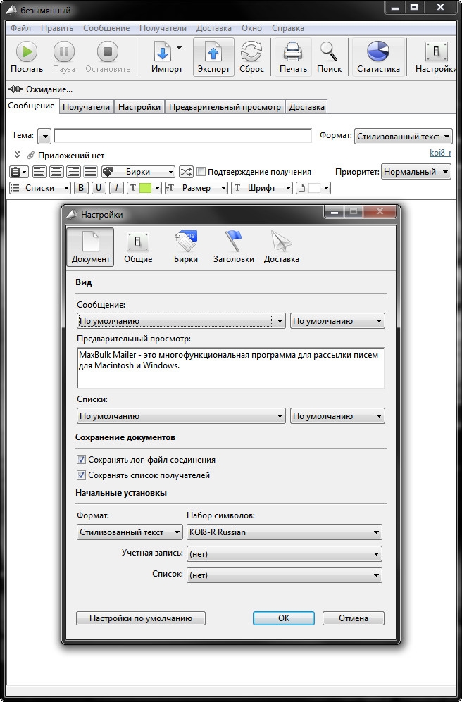 MaxBulk Mailer - программа для составления и рассылки писем. С помощью MaxBulk Mailer, вы сможете посылать индивидуализированные пресс-релизы, прайс-листы и любой текст или HTML документ своим клиентам. Программа отличается скоростью работы, легкостью в настройке и использовании. Позволяет работать как в текстовом формате, так и HTML, позволяющем стилизовать текст документа, а также обладает полной поддержкой файловых вложений в письма.
